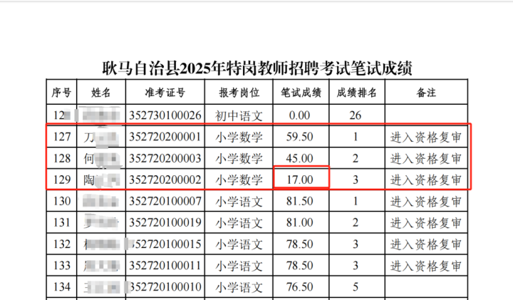 一考生小学数学笔试成绩17分进资格复审。